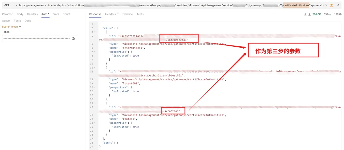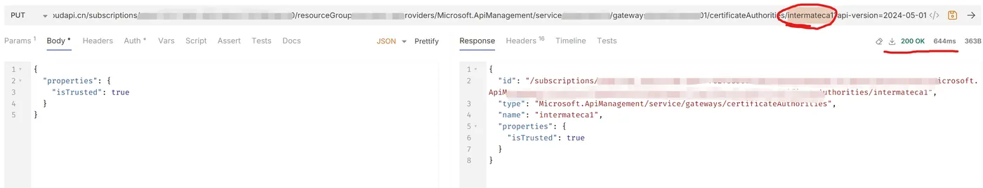 请求认证同上,<00000000-0000-0000-0000-000000000000>, <rg1>, <apimService1>,<gw1> 均需要替换为正确值,<certificateId> 值为第二步返回的根证书ID和中间证书ID
