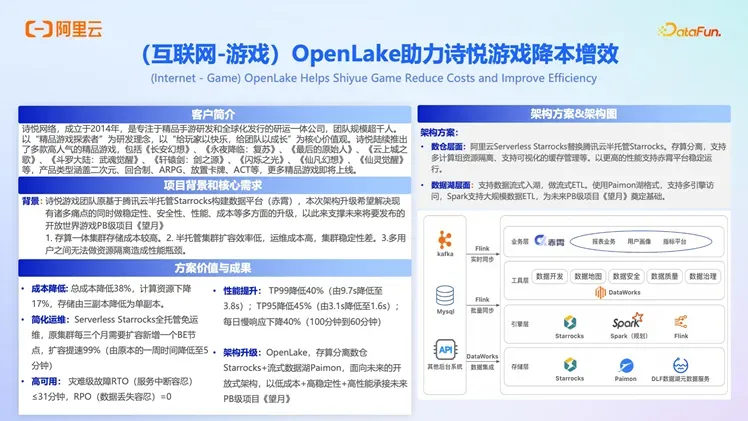 在行业实践上, OpenLake 助力诗悦游戏降本增效,并提供实时湖仓能力,总成本降低 38%,计算资源下降 17%,以低成本 + 高稳定性 + 高性能承接未来各种业务应用。