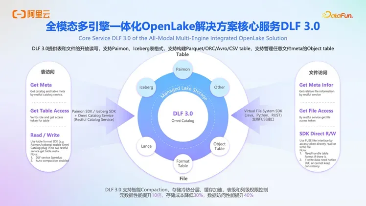阿里云 OpenLake 通过 DLF 全新支持 Paimon Table、Iceberg Table、Format Table(虚拟概念,支持 Parquet、ORC、Avro、CSV 文件格式,表类型以文件格式为命名)、 Lance Table、 Object Table 共 5 类目录服务,覆盖结构化数据的兼容模式和独立生态模式,对象存储文件和 AI 打包 AI 等多种形态,全面支持数据计算需求、多模态检索需求和 AI 模型需求。同时在工作台层面提供 OpenLake Studio 可对大数据和 AI 进行任务编写,发布等。 在存储层面也全面支持了全托管存储(可以更安全和高效的使用 OSS 存储,管控表级和列级权限,管理引擎和存储的访问账号等),结合引擎全系支持 AI Function 以后,阿里云 OpenLake 解决方案升级成为全模态数智一体企业级解决方案。