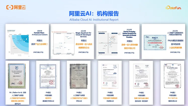 在算力方面,预计到 2028 年,中国智能算力规模将达到 2781.9 EFLOPS(每秒百亿亿次浮点运算次数)。在市场规模方面,IDC 预测到 2028 年中国人工智能总投资规模将突破 1,000 亿美元,五年复合增长率高达 35.2%。其中,生成式 AI(GenAI)的投资占比将从 2024 年的 18.9% 快速增长至 2028 年的 30.6%,投资规模将超过 300 亿美元,五年复合增长率为 51.5%。市场细分数据也明确指出,智算服务(高网高性能计算)将占据主导地位,而推理服务的数量将大幅超越训练服务。而阿里云也在全球各类机构的AI报告中获得多项领先的评测与奖项。