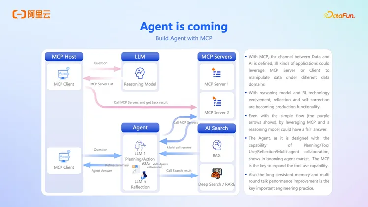 Agentic Data(智能体数据)的核心逻辑在于,数据和 AI 之间需要建立明确的通道。符合 MCP(Model Context Protocol)协议的数据可以提供给 AI 使用,而 AI 作为 Agent,则可以反过来在数据上进行操作和使用。MCP Server 定义了这一通道,使得各种应用能够利用 MCP Server 或 Client 来操作不同数据域下的数据。