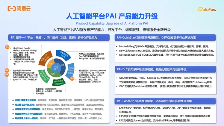 阿里云人工智能平台 PAI 支持了世界顶级大模型千问/万象系列的商业化 AI 训练和推理,是 AI 工程全链路一站式平台,提供了资产管理(异构 GPU/CPU、存储)、资源管理(分布式弹性自愈调度、抢占式实例)、高可用训练和推理深度优化以及从模型到 Agent 的开发能力支持。