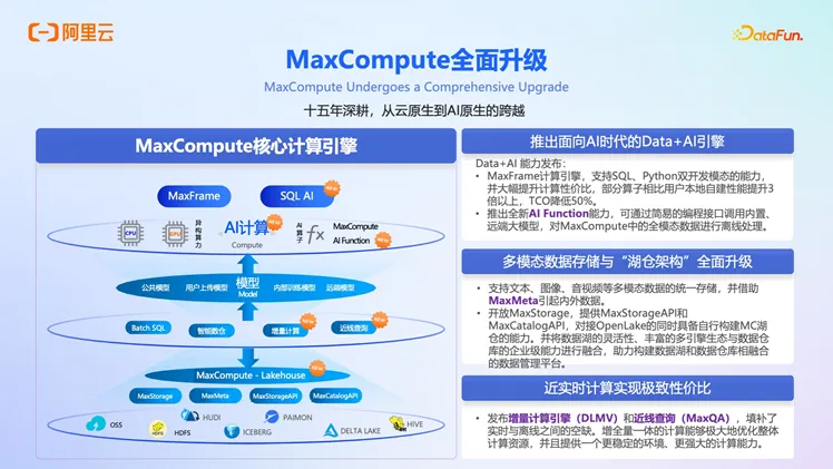 MaxCompute 基于“Data+AI 一体化”的设计理念,构建了一套覆盖数据、算力、模型与融合层的能力体系,旨在打造真正意义上的 AI 原生数据仓库。实现从“传统数据仓库”向“AI 原生数仓”的跃迁。