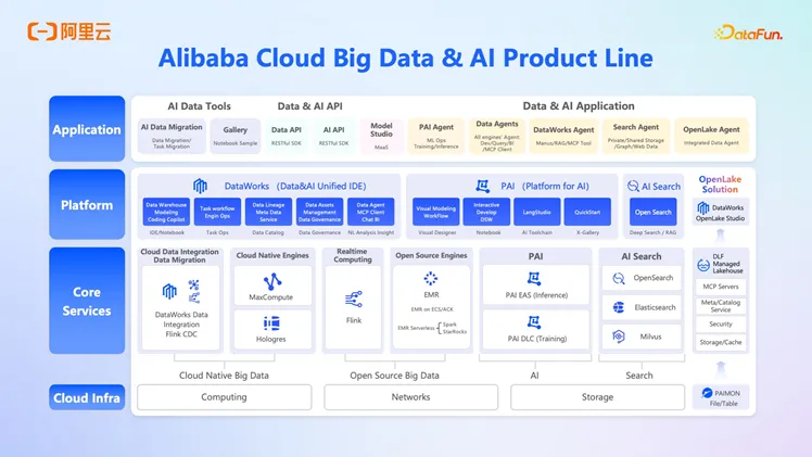 基于 AI 时代的浪潮与趋势,阿里云推出 OpenLake 解决方案,通过 DLF 在统一开放的湖仓上实现了结构化、半结构化、非结构化数据的统一存储与管理,通过所有计算引擎的湖仓升级支持一份数据多个计算引擎(MaxCompute、Hologres、Flink、EMR、PAI、AI 搜索等)协同计算,使得 OpenLake 湖仓成为 Data 和 AI 的共同底座。同时通过 DataWorks 提供的 OpenLake Studio 可对大数据和 AI 任务的开发和发布提供一体化开发体验以及 Agent 形式的服务支持。