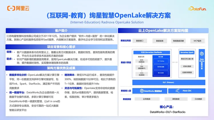 互联网教育企业绚星智慧通过 OpenLake 让同一份数据支持 Flink,Spark,StarRocks 多种引擎对接,满足不同场景的用数需求,整体成本降低 50%,查询性能提升 300%,端到端数据 10 分钟可见。