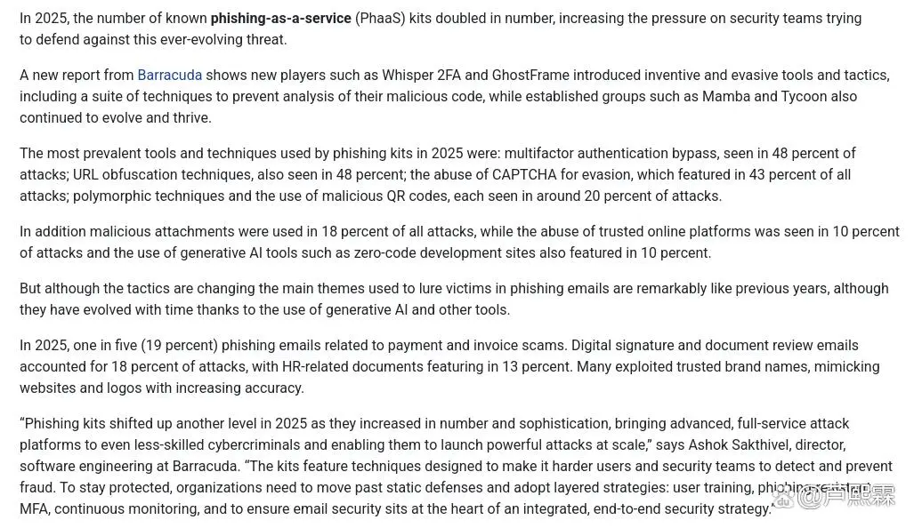 近年来,网络钓鱼攻击呈现高度产业化和模块化趋势,其中“钓鱼即服务”(Phishing-as-a-Service, PhaaS)模式成为主流。2025年,已知PhaaS工具包数量较前一年翻倍增长,显著降低了攻击者实施复杂钓鱼活动的技术门槛。本文基于Barracuda发布的2025年度威胁报告,系统分析当前PhaaS生态的结构特征、关键技术手段及其对传统安全防御体系的挑战。重点聚焦于多因素认证(MFA)绕过机制与URL混淆策略两大核心攻击向量,结合实际攻击样本与技术实现细节,揭示其运作逻辑与检测难点。研究进一步探讨现有防护机制的局限性,并提出融合实时URL分析、会话行为建模与MFA交互验证的纵深防御框架。通过代码示例展示典型反向代理式MFA绕过流程及动态URL混淆构造方法,为安全研究人员与企业防御体系提供可操作的技术参考。结果表明,仅依赖静态规则与域名信誉的传统网关已难以应对高度动态、伪装性强的现代钓鱼攻击,需转向以行为感知与上下文关联为核心的主动防御范式。