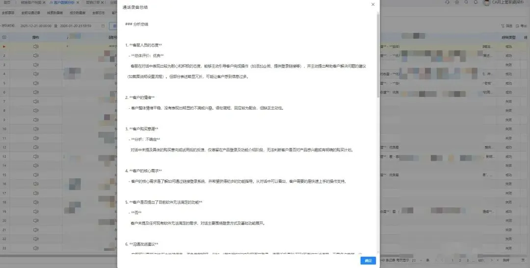 销售部担心的“转写不准”“提取无效信息”等问题也直接被百宝箱智能体用实力征服。售前拓展每月产生超 500 小时的售前拓展电话录音,智能体可一键转化为结构化文字稿,不仅没有错别字,还能准确识别行业术语,比人工听录还靠谱;智能体会根据录音内容自动识别客户意向度(高 / 中 / 低)、提炼核心需求(如“需要批量导入订单”),还能标记销售话术漏洞(如 “未提及售后保障”“产品优势讲解不清晰”),甚至会给出优化建议,智能标记分析帮助精准抓住商机;智能体可以自动整合客户的公司规模、行业属性、需求痛点、跟进进度等信息,生成完整的客户档案和客户画像规整,方便后续精准跟进。