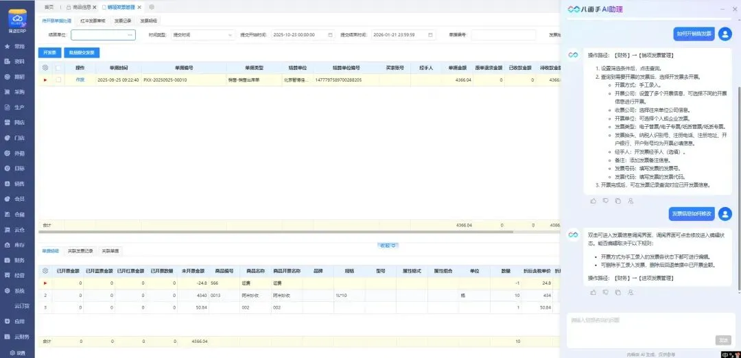 现场模拟客户问:“怎么在系统里开销售发票?”智能体立马给出分步骤操作指南:【财务】→【销项发票管理】,每一步都精准对应 ERP 界面,还主动对必填信息等填写要求逐一说明,毫无遗漏。有客户追问“开错的发票能修改吗?”,智能体立即补充操作路径,比人工解答还细致、高效。
