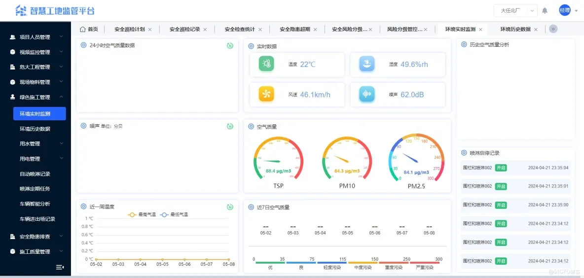综合运用物联网、自动控制与大数据技术,实现对颗粒物(PM2.5、PM10)、噪声、气象参数(温湿度、风速、风向、大气压)等环境指标的实时监测。设备符合计量认证标准,具备环保产品资质,支持与喷淋、雾炮等降尘装置智能联动,助力提升工地文明施工与绿色施工水平。
