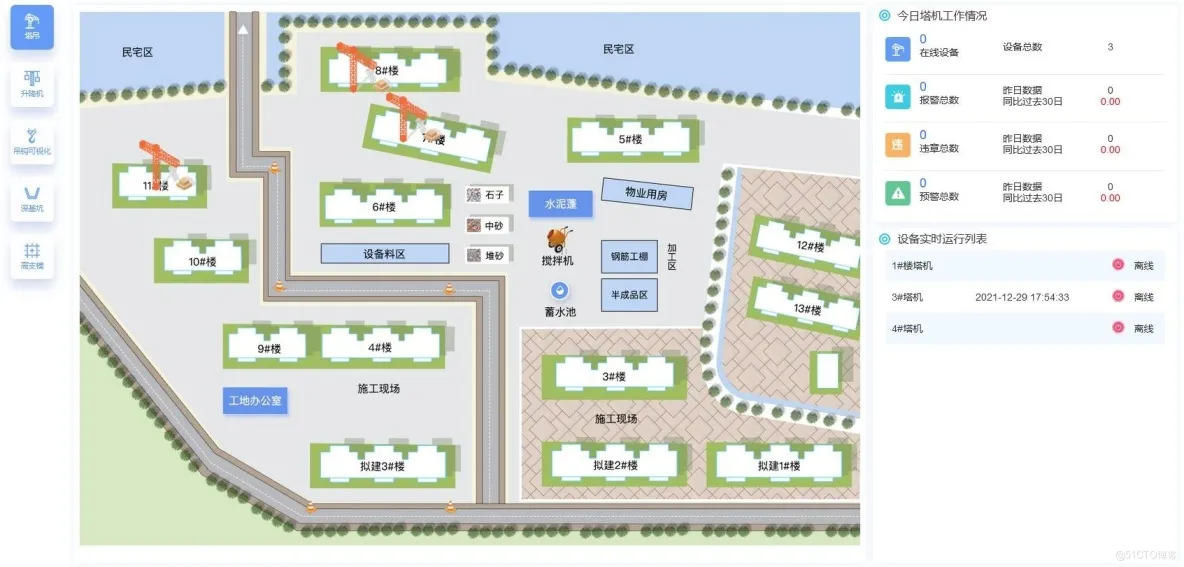针对塔吊作业中的超载、碰撞、违规操作等安全隐患,本系统实时监测塔机运行状态,具备载重预警、区域禁行、群塔防碰撞等功能。所有运行数据与报警信息实时上传至云平台,实现多维度数据分析与远程可视化监管,为施工单位与安全监督部门提供全面的塔机安全管控服务。