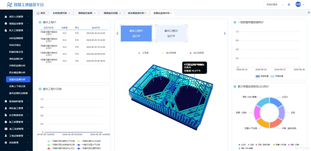 基于物联网传感器与自动采集技术,对基坑支护结构位移、沉降、支撑轴力、地下水位等关键指标进行全天候自动化监测。数据实时上传至云平台,通过专业分析模型进行稳定性评估与趋势预测,及时发布预警信息,为深基坑施工安全提供科学依据与决策支持。
