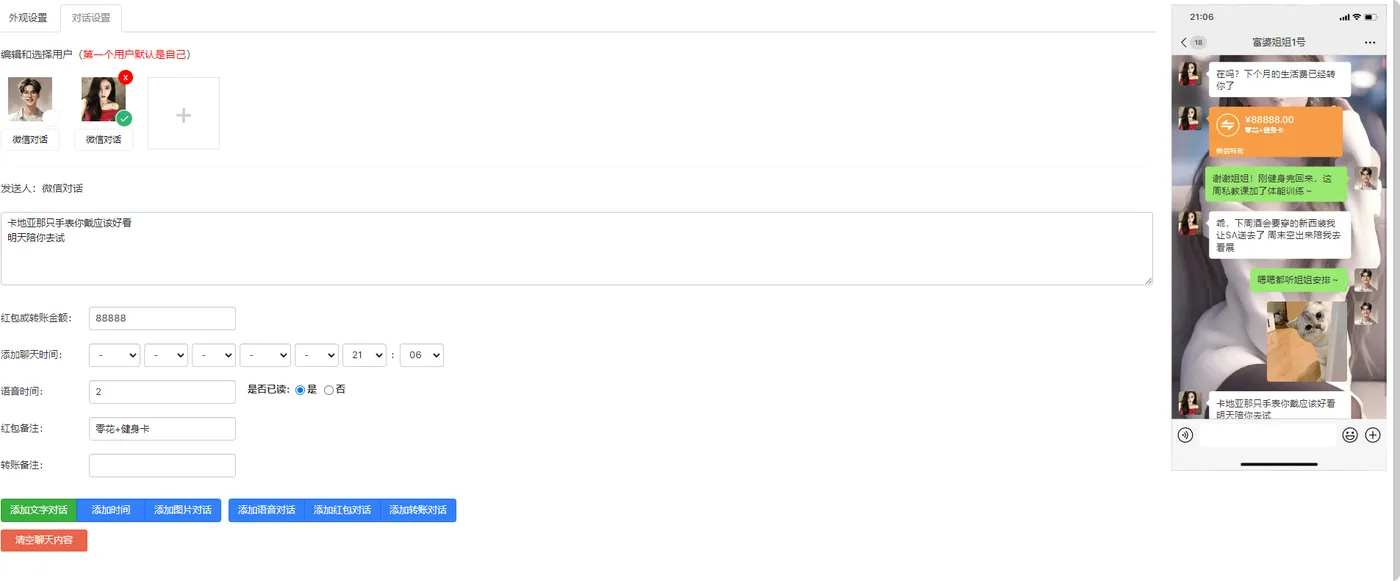 这是一个可以在线生成微信风格聊天截图的工具,支持以下功能: