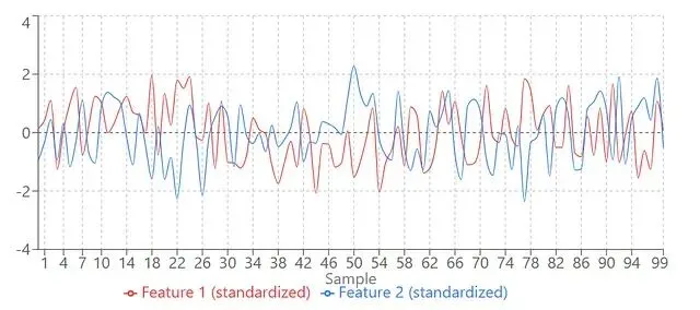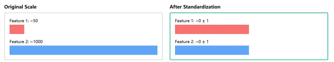 标准化之前,特征1(红色,小尺度)和特征2(蓝色,大尺度)放一起,红色那条几乎看不见。标准化之后,两个特征尺度一致,都能清晰显示出来。模型终于可以公平对待它们了。