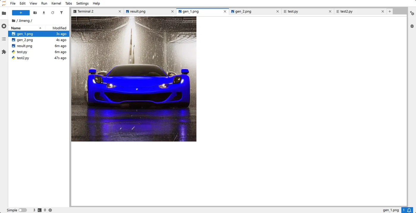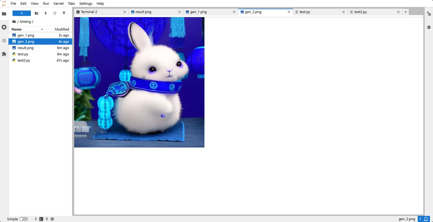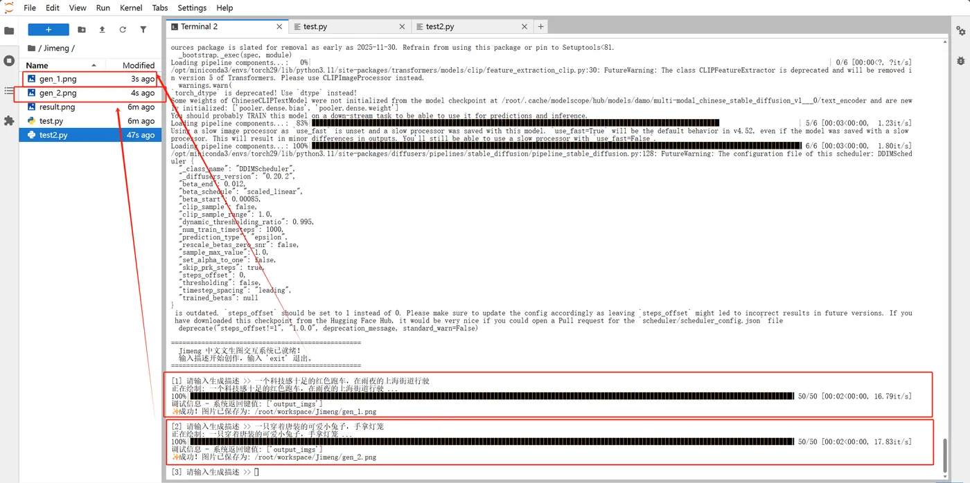 我们将创建一个名为 test_jimeng.py 的脚本。它不仅解决了兼容性问题,还支持一次加载模型、多次交互生成,并具备极强的代码健壮性。