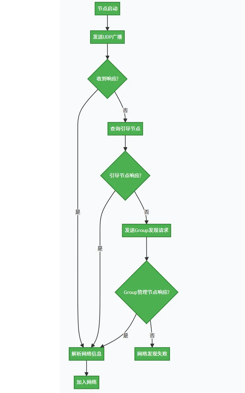 节点启动 发送UDP广播 收到响应? 解析网络信息 查询引导节点 引导节点响应? 发送Group发现请求 Group管理节点响应? 网络发现失败 加入网络