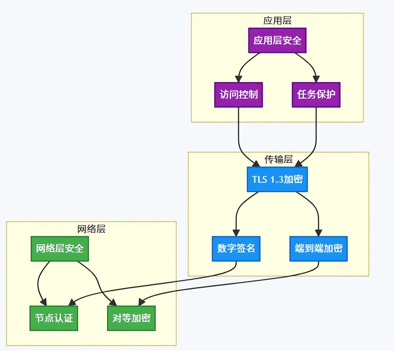 网络层 传输层 应用层 网络层安全 节点认证 对等加密 TLS 1.3加密 数字签名 端到端加密 应用层安全 访问控制 任务保护