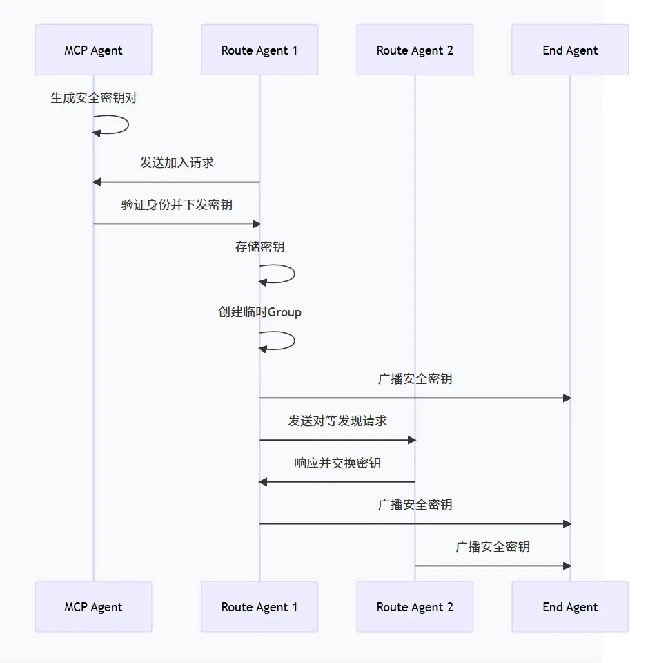 MCP Agent Route Agent 1 Route Agent 2 End Agent 生成安全密钥对 发送加入请求 验证身份并下发密钥 存储密钥 创建临时Group 广播安全密钥 发送对等发现请求 响应并交换密钥 广播安全密钥 广播安全密钥 MCP Agent Route Agent 1 Route Agent 2 End Agent