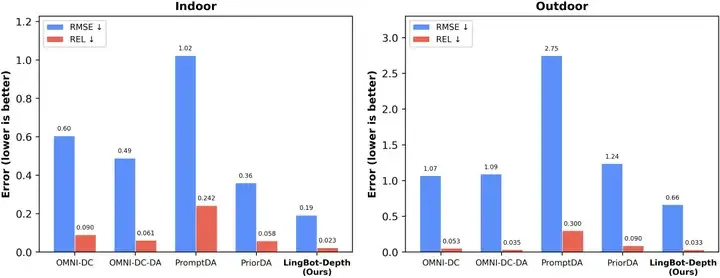 注解:在最具挑战的稀疏深度补全任务中,LingBot-Depth 性能整体优于现有多种主流模型。(图中数值越低代表性能越好。)