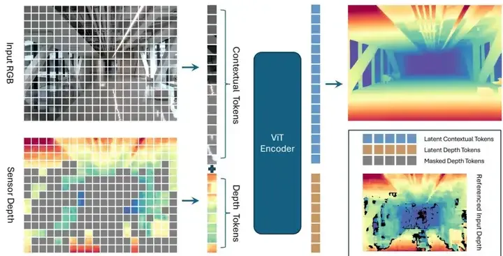 在家庭和工业环境中,玻璃器皿、镜面、不锈钢设备等透明和反光物体物体十分常见,但却是机器空间感知的难点。传统深度相机受制于光学物理特性,在面对透明或高反光材质时,往往无法接收有效回波。针对这一行业共性难题,灵波科技研发了“掩码深度建模”(Masked Depth Modeling,MDM)技术。训练过程中,使用海量 RGB–深度图像对,但刻意遮挡其中一部分深度区域,让模型仅根据 RGB 图像去预测缺失的深度值。随着训练进行,模型逐渐学会建立“外观—几何”之间的对应关系,也就是从“物体看起来像什么”推断“它大概有多远”。