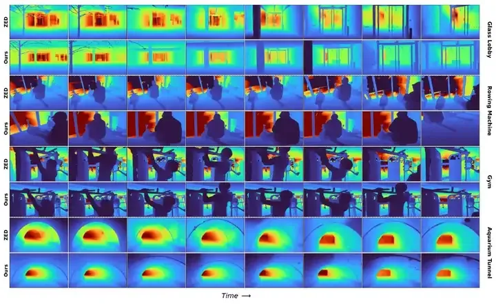 除单帧精度优势外,LingBot-Depth 还表现出优异的时间一致性。在无需显式时序建模的情况下,模型即可为视频输入生成稳定、连贯的深度序列,有效避免闪烁与结构跳变问题,为机器人操作、AR/VR 以及动态场景感知等应用提供可靠的连续空间理解能力。
