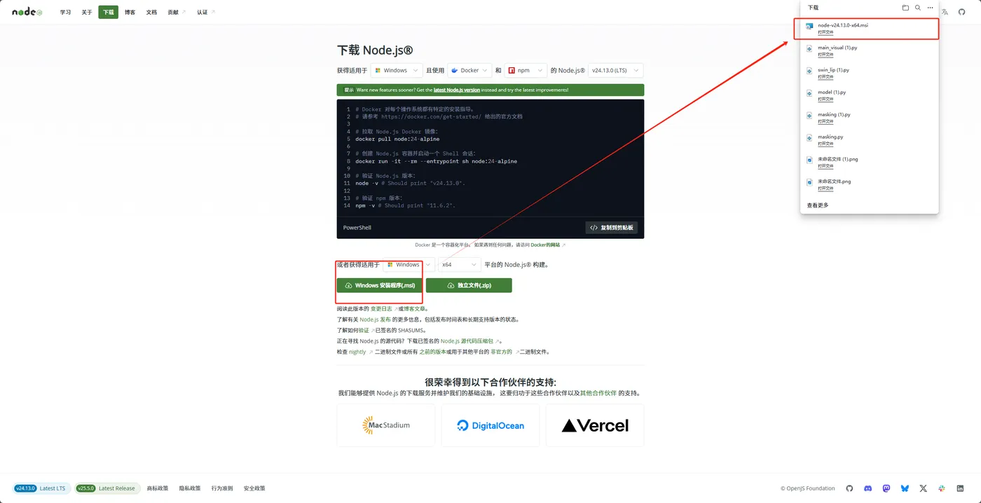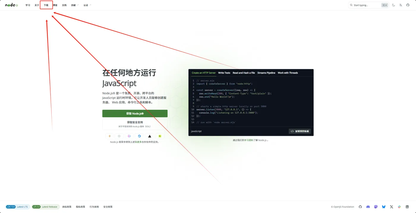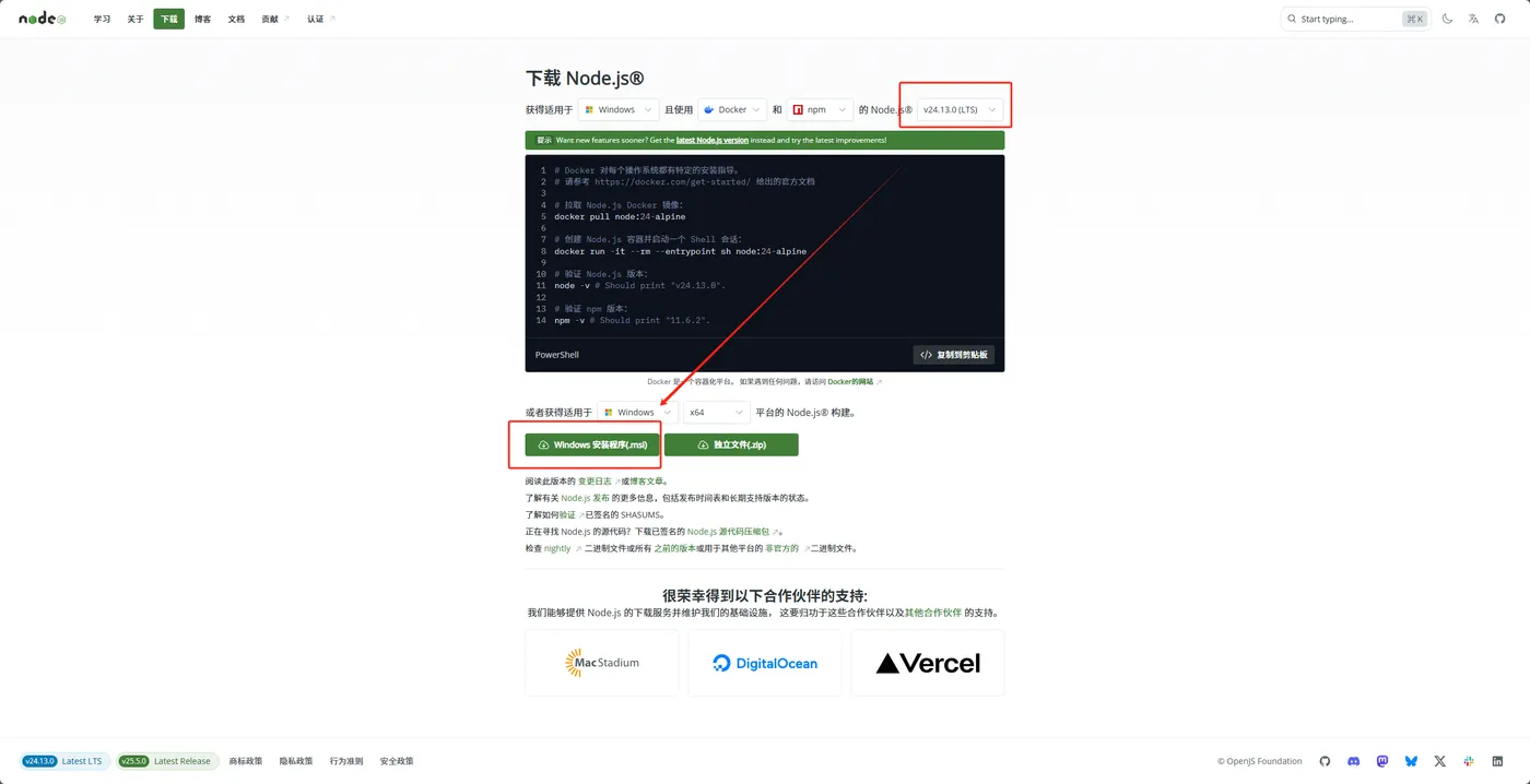 3. 前往 Node.js 官网[2] 下载最新的 v22 或 v24 稳定版并安装。