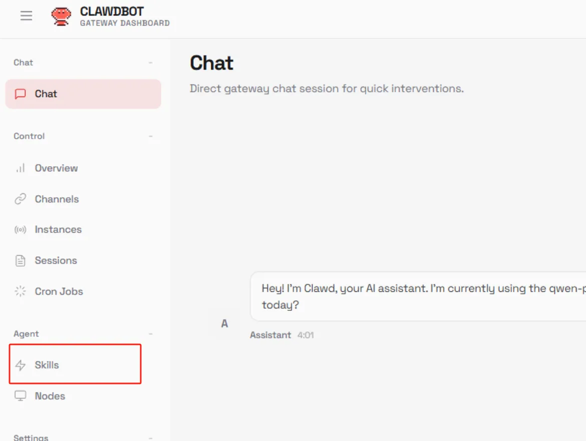 1. 在网页后台点击左侧 Skill(技能) 可以看到有非常多的API可以配置,过程相对来说还是比较繁琐的,有机会的话下次专门再出一期博客来讲,目前的话他可以实现通过对话来进行一些本地的文件操作,命令操作等等。整体来说还是不错的