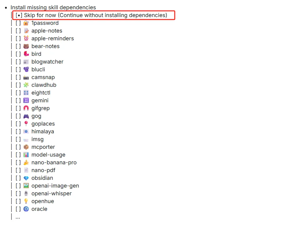 1. Skill Dependencies:选Skip for now 这些是扩展的,目前配置比较麻烦,可以后续再配置