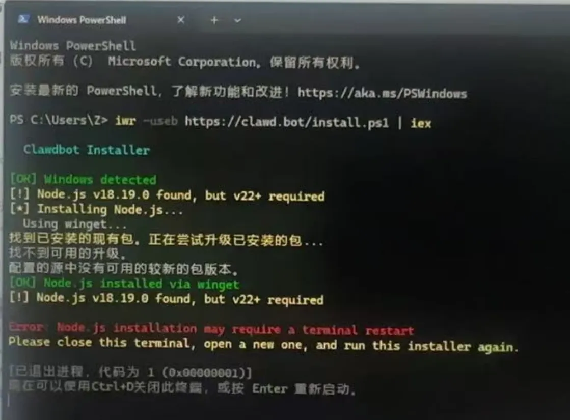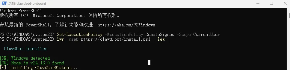 • 操作: 在 PowerShell 输入: powershell iwr -useb https://clawd.bot/install.ps1 | iex