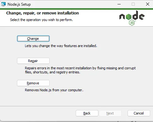 如果版本不够新,执行安装命令的时候程序会尝试安装新版的Node.js,但是大概率会失败,还是手动比较好,失败的话会显示以下界面: 操作: 1.可以直接通过新的安装包对上一个版本的Node.js进行remove