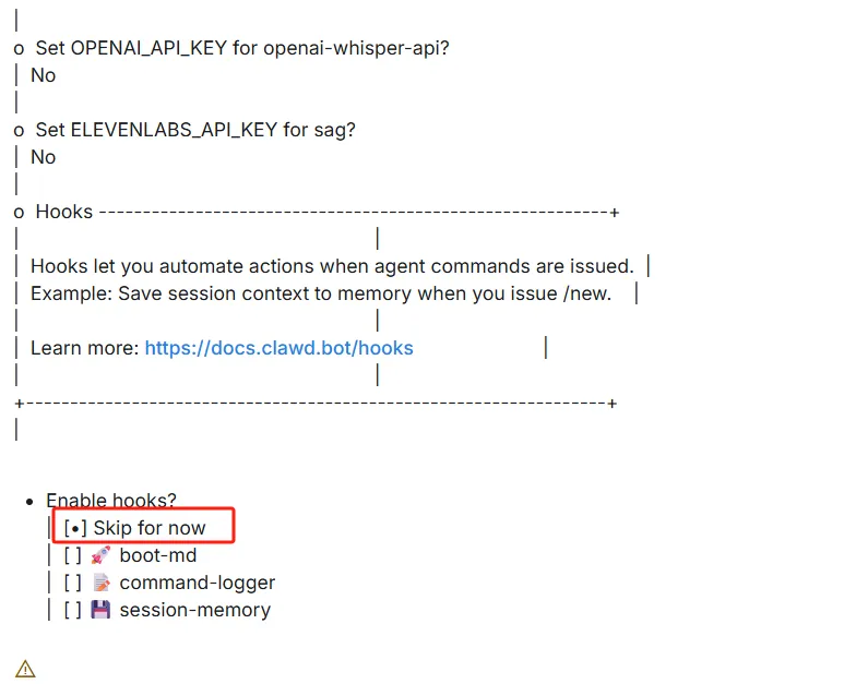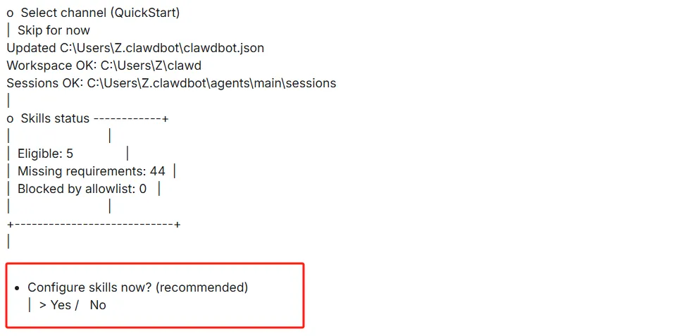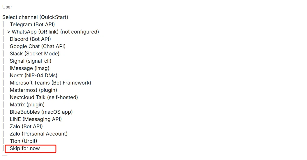 1. Channels (远程控制):选 Skip for now。我们先在本地跑通,以后再连 Telegram。