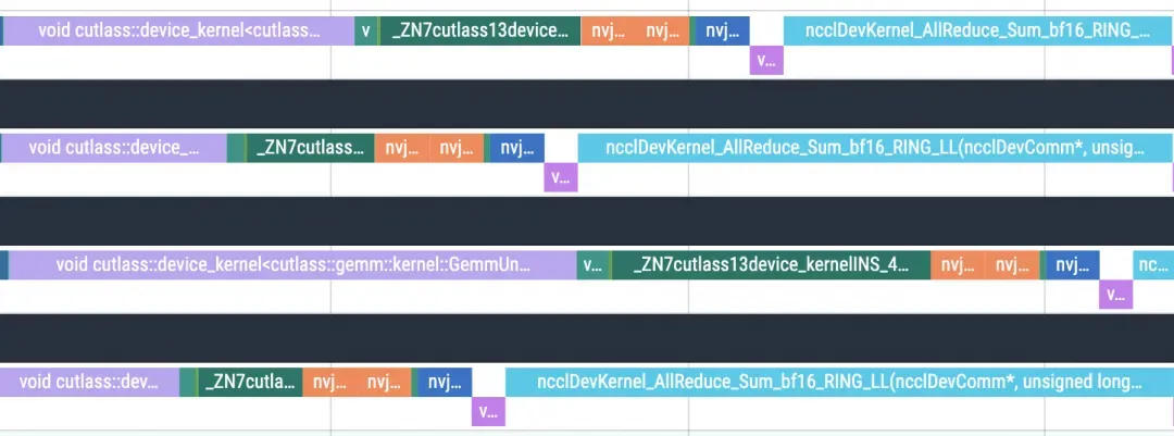 测试表明,如下图timeline所示,方案B受限于模型结构(MoE导致的专家节点负载不均衡)以及TP模式下通信开销,当出现个别慢节点时,整个Batch的完成时间会被拖慢;相比之下,方案A中各实例相互独立,无通信开销,可以更好的利用数据并行性。在实际测试中,BS=16的情况下,方案A比方案B降低12ms,成为线上实际部署模式。