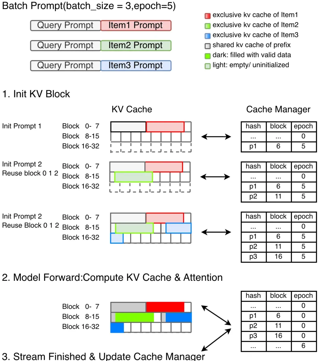 2. 批次内复用: 当调度该批次内的后续请求时,调度器会查询 Cache Manager,发现公共前缀已存在映射关系,从而直接复用已分配的 Block ID,无需重新分配。