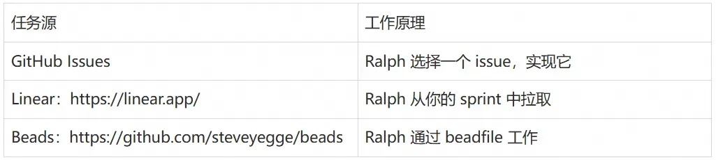 本文中的示例使用本地 prd.json。但 Ralph 可以从任何地方拉取任务: