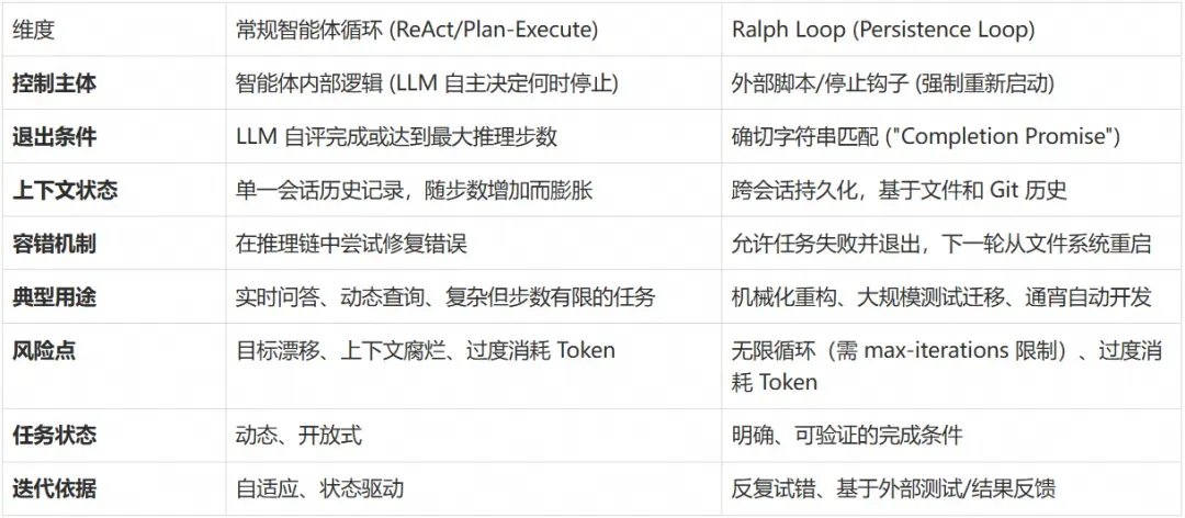 在开发者语境中,"agent loop" 通常指智能体内部的感知—决策—执行—反馈循环(即典型的感知-推理-行动机制)。而 Ralph Loop 更侧重于迭代执行同一任务直至成功,与典型智能体循环在目的和设计上有所不同: