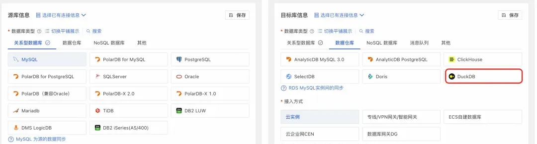 RDS DuckDB 实例已与阿里云 DTS 深度集成。用户在创建 DTS 任务时,只需将目标数据库类型选择为 DuckDB,即可自动获得高效的入库性能,无需进行繁琐的参数配置与性能调优。