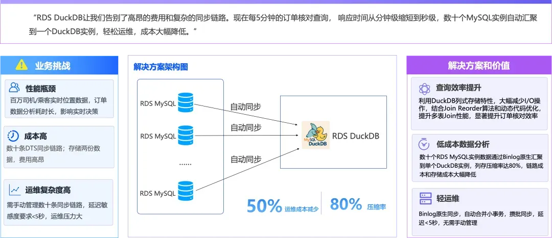 RDS MySQL 将 DuckDB 嵌入到 MySQL 内核,利用 DuckDB 在分析查询场景下的性能优势,弥补了 MySQL 在 AP(分析处理)能力上的不足。