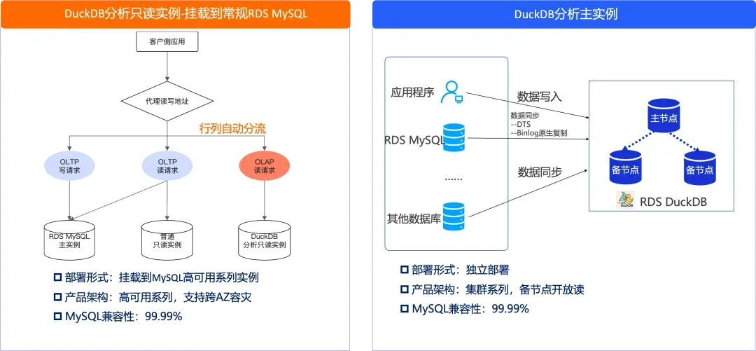 基于 DuckDB 引擎的基础能力,我们推出了 DuckDB 只读实例。DuckDB 节点作为一个数据副本,接受来自主库的 binlog 日志回放,可以独立对外提供读请求的服务。同时,结合代理层的行列自动分流能力,MySQL 主节点和DuckDB节点共同提供了一个完整的HTAP 解决方案。