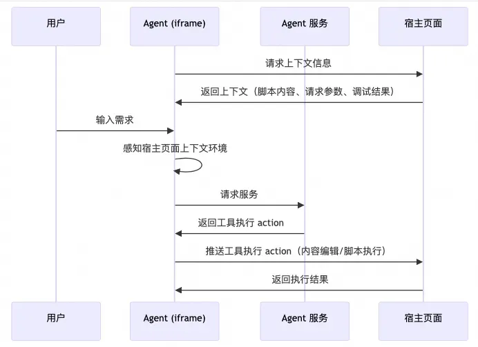 2. Agent 感知宿主页面上下文环境,然后请求服务,并推送内容编辑、脚本执行等工具执行 action 给宿主页面。