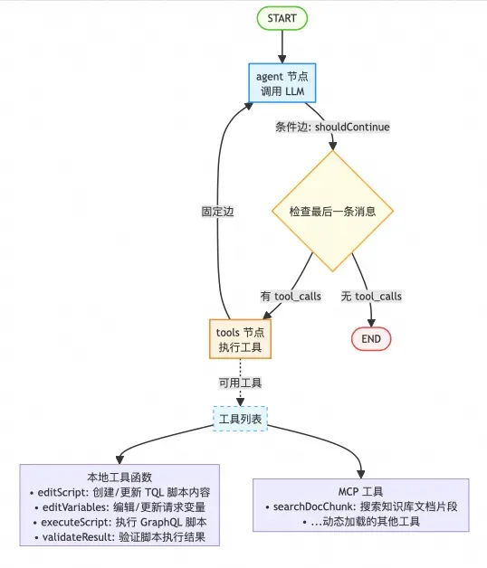 import { StateGraph, END, START } from '@langchain/langgraph'; // 创建状态图 const agentGraph = new StateGraph({ channels: { messages: { reducer: (prev, next) => [...prev, ...next], default: () => [], }, }, }); // 添加节点 agentGraph.addNode('agent', async (state) => { const response = await model.invoke(state.messages); return { messages: [response] }; }); agentGraph.addNode('tools', async (state) => { const lastMsg = state.messages[state.messages.length - 1] as AIMessage; const toolMessages = []; for (const toolCall of lastMsg.tool_calls || []) { const result = await tools .find((t) => t.name === toolCall.name) .invoke(toolCall.args); toolMessages.push( new ToolMessage({ content: result, tool_call_id: toolCall.id }), ); } return { messages: toolMessages }; }); // 设置边 agentGraph.addEdge(START, 'agent'); agentGraph.addEdge('tools', 'agent'); // 条件边:根据是否有 tool_calls 决定路由 agentGraph.addConditionalEdges( 'agent', (state) => { const lastMsg = state.messages[state.messages.length - 1] as AIMessage; return lastMsg.tool_calls?.length > 0 ? 'tools' : END; }, { tools: 'tools', [END]: END }, ); // 编译图 const graph = agentGraph.compile();