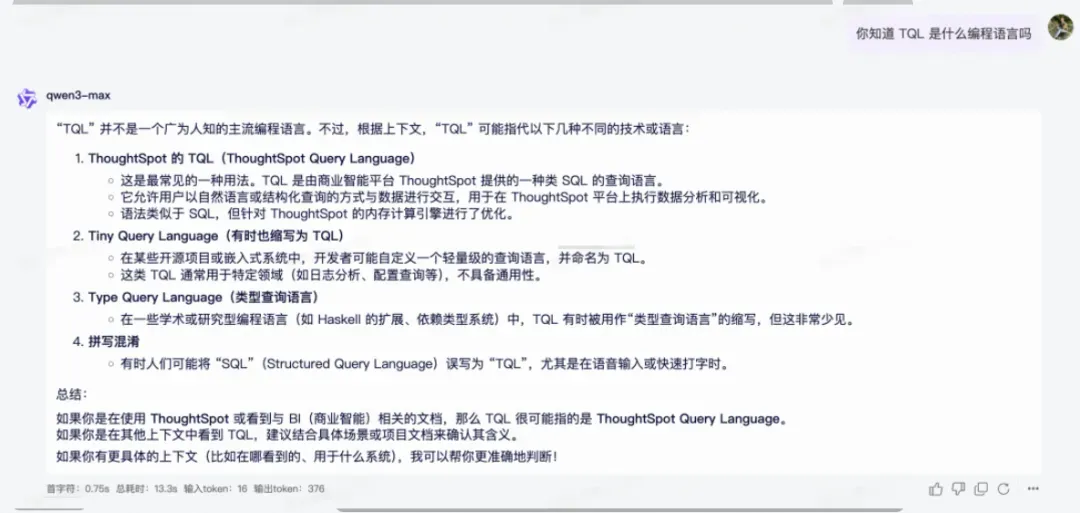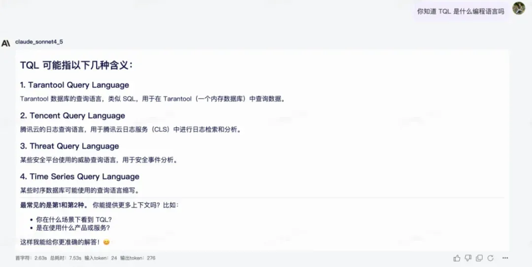 模型不了解私域知识这个问题,在自建 Agent 的时候往往是一个共性问题,所以才需要大量的提示词 & 工具 & 知识库。强如 Claude ,公司自己的 Qwen ,都不知道 TQL 的含义。
