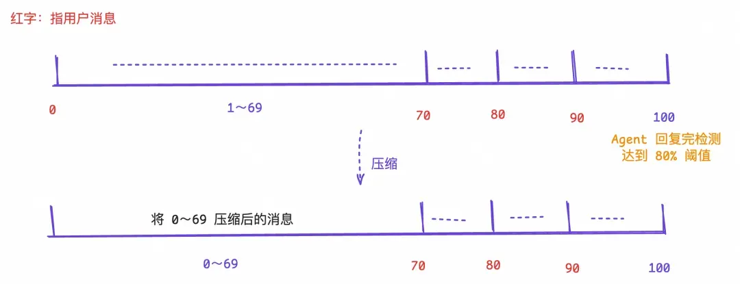 { enabled: true, // 启用压缩 dangerThreshold: 80, // 1-100 当上下文窗口使用超过 80% 时触发压缩 keepRecentRounds: 3, // 保留最近 3 轮用户对话开始之后的消息不被压缩 }