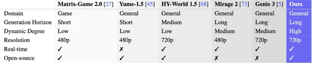 LingBot-World 在适用场景、生成时长、动态程度、分辨率等方面均处于业界顶尖水平