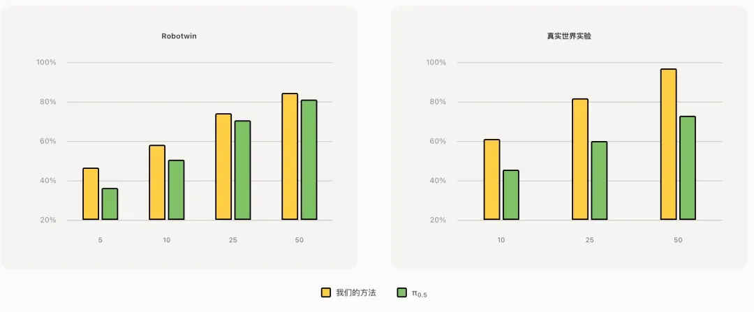 视频模型在适应新任务时表现出卓越的数据效率。仅需少量演示,模型就能快速调整其预测以匹配目标行为。这种少样本能力大大减少了在新场景部署机器人时的数据收集负担,使实际部署更加便捷。