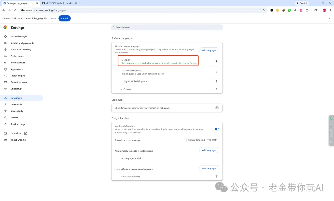 Chrome语言是英文吗?设置 → 语言 → 英语置顶。