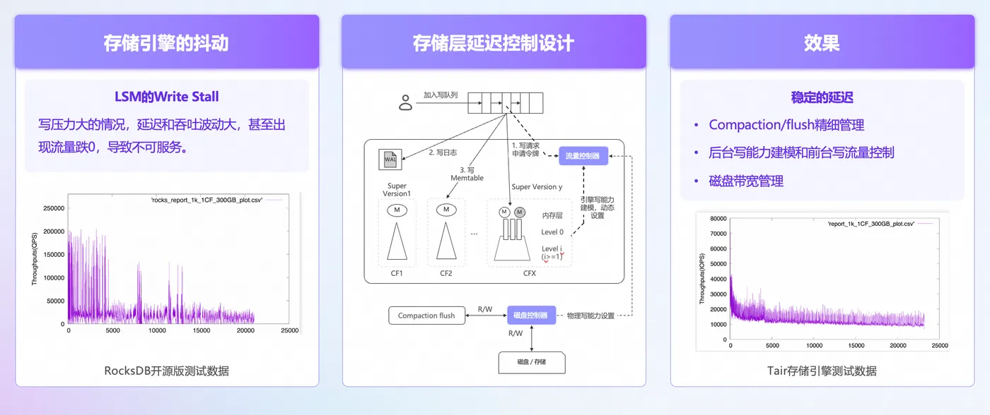 另一方面,Tair Serverless KV 深度优化改造了LSM-Tree结构,通过 Write Stall 避免机制支持用户的大 value 数据以稳定的低延迟和高吞吐写入通过墓碑数据的自适应清理和效率优化机制,保障稳定的读延迟和空间占用,数据连续存储无空间碎片,并提供高压缩能力,显著提升存储效率。