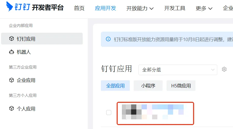选择「应用开发」→「钉钉应用」菜单,点击对应的钉钉应用。
