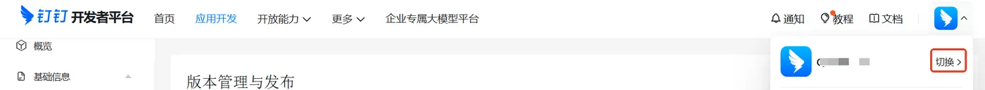 以管理员身份登录钉钉开发平台(https://open-dev.dingtalk.com/),点击右上角图标选择对应组织。