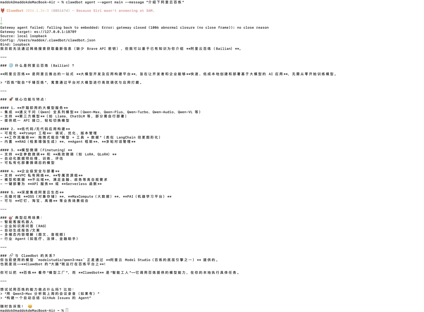 clawdbot agent --agent main --message "介绍下阿里云百炼"