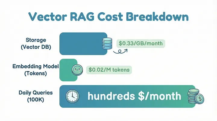 成本模型是可预测计算的。像 Pinecone 这样的无服务器方案,存储加上读写操作的费用约为 0.33 美元/GB/月;在通用硬件上部署的自托管方案成本更低。Embedding 生成(例如使用 text-embedding-3-small 模型)会增加约 0.02 美元/M tokens 的成本。一个每天处理 10 万次查询的生产部署每月可能只需花费数百美元,与依赖大量 LLM 调用的方案相比这只是九牛一毛。