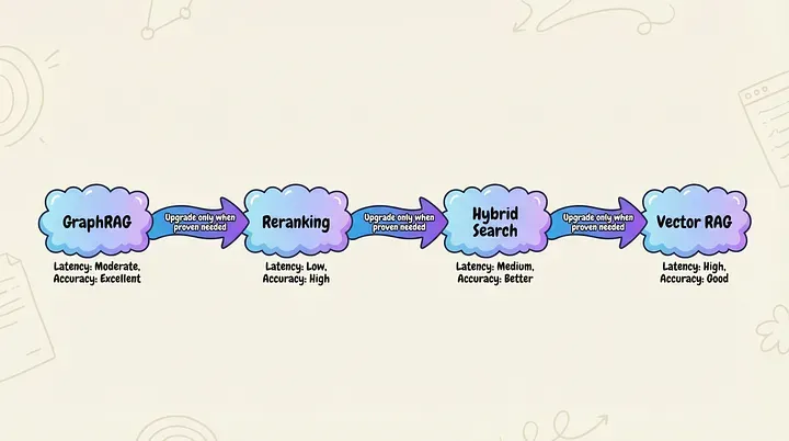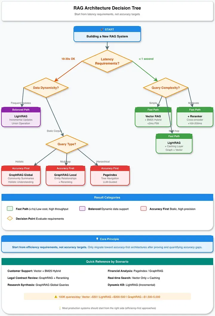 架构选型应以延迟要求为先,而非准确率目标。若应用需实现次秒级响应,则无论 GraphRAG 与多数智能体驱动方法在准确率上具备何种优势,均已被排除在考量范围之外;此时,支持可选重排序的向量搜索即成为可行方案的上限。